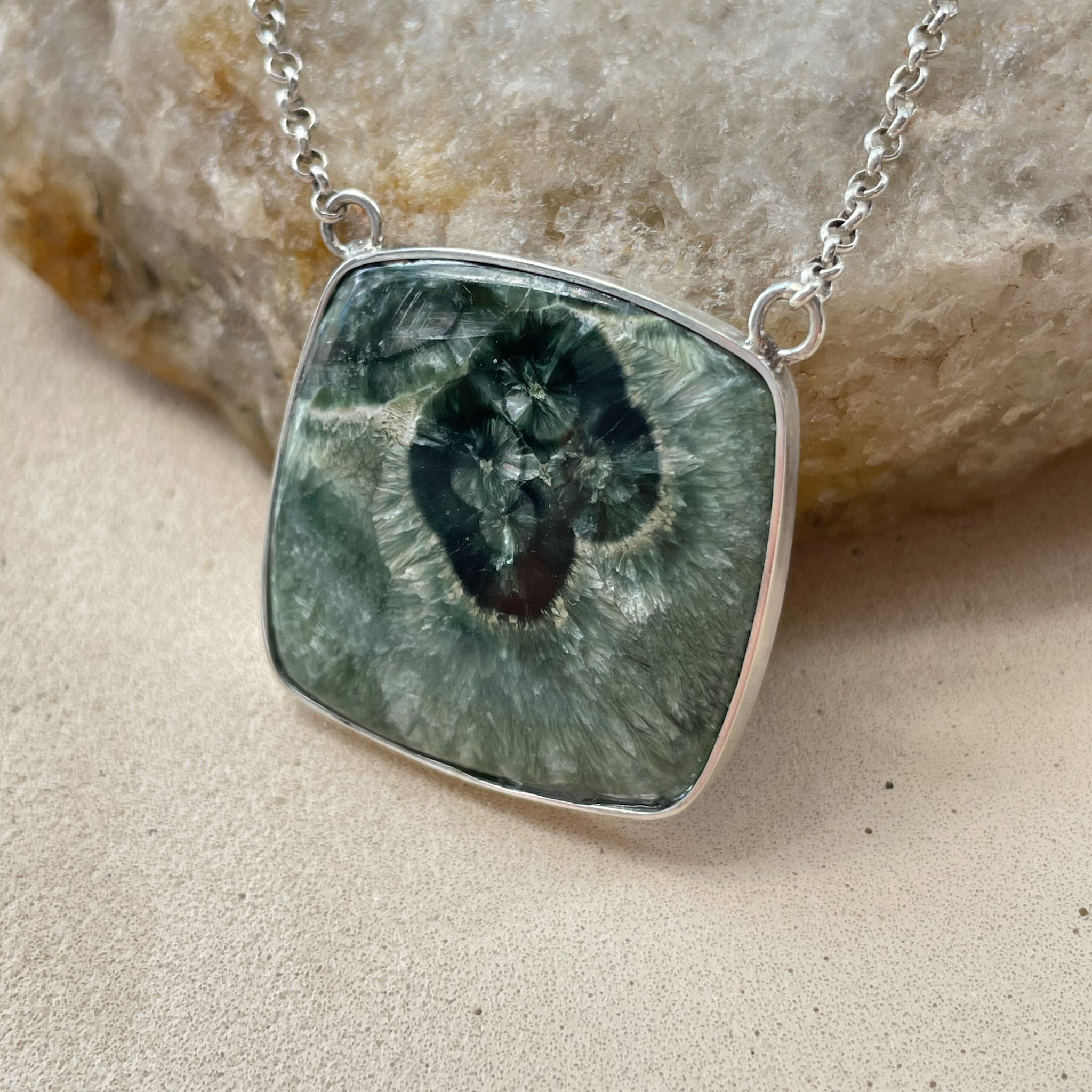 A Serafinita é encontrada apenas na região do lago Baikal, na Sibéria, possui uma cor verde profunda com inclusões prateadas de mica que lembram asas de anjos. Com uma vibração bastante elevada, nos ajuda a acessar níveis mais altos de consciência, e de maior clareza mental e espiritual. Auxilia no reequilíbrio do fluxo energético, movimentando pontos de bloqueio e estagnação e auxiliando na regeneração celular. Também ressoa fortemente com a esfera dos Serafins, ordem mais elevada dos anjos.