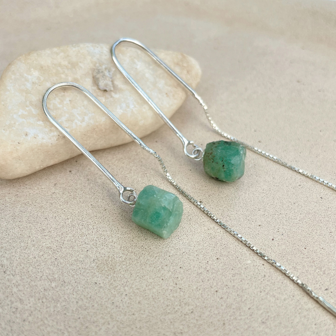 Brinco de Esmeralda bruta natural em fio de prata 925