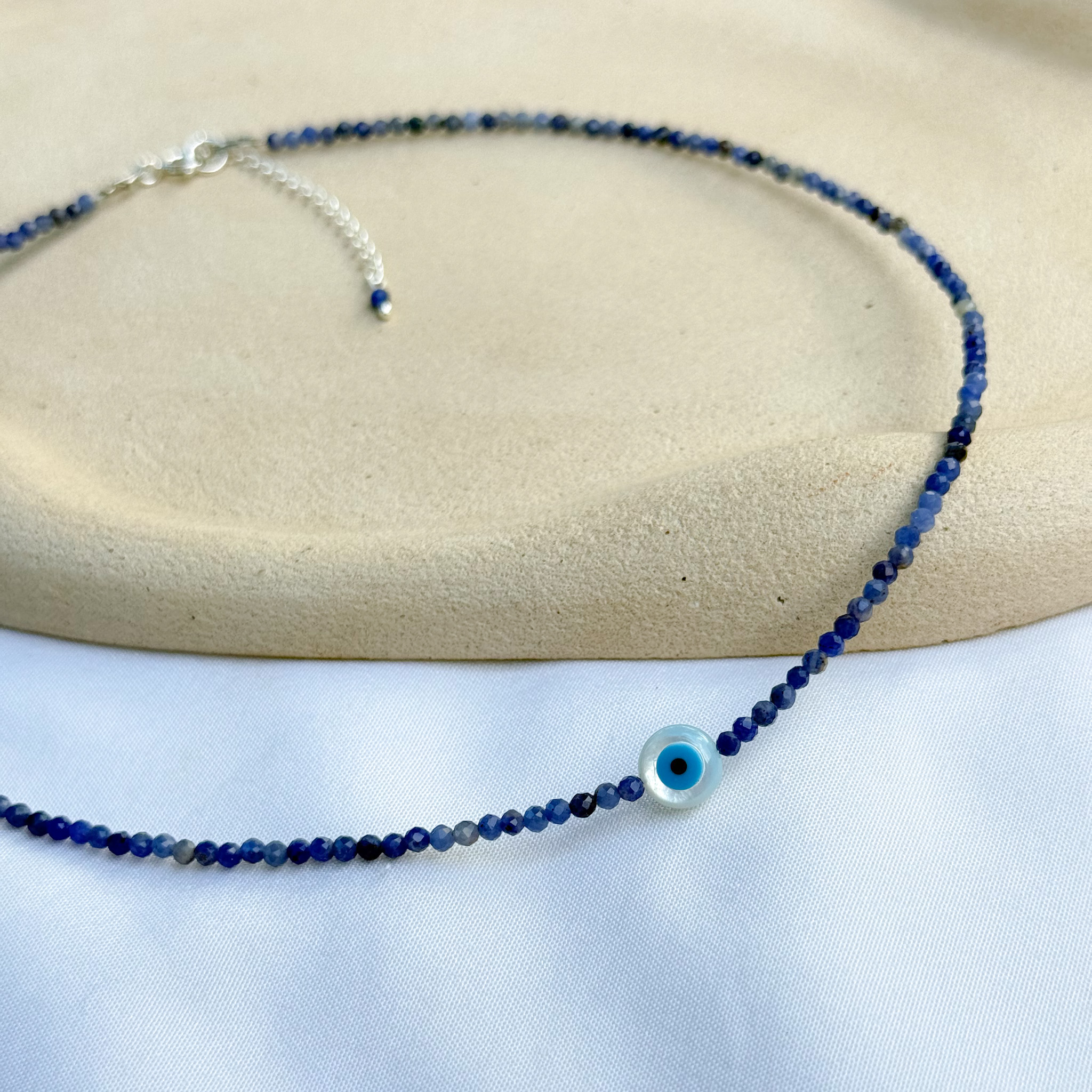 Choker de Sodalita natural em esferas facetadas de 2mm com Olho Grego em Madrepérola