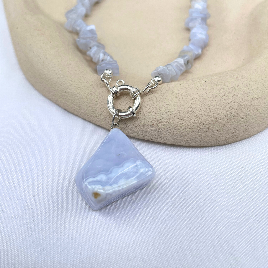 Colar de ágata blue lace em cascalho com fecho bóia e pingente de ágata blue lace em prata 925