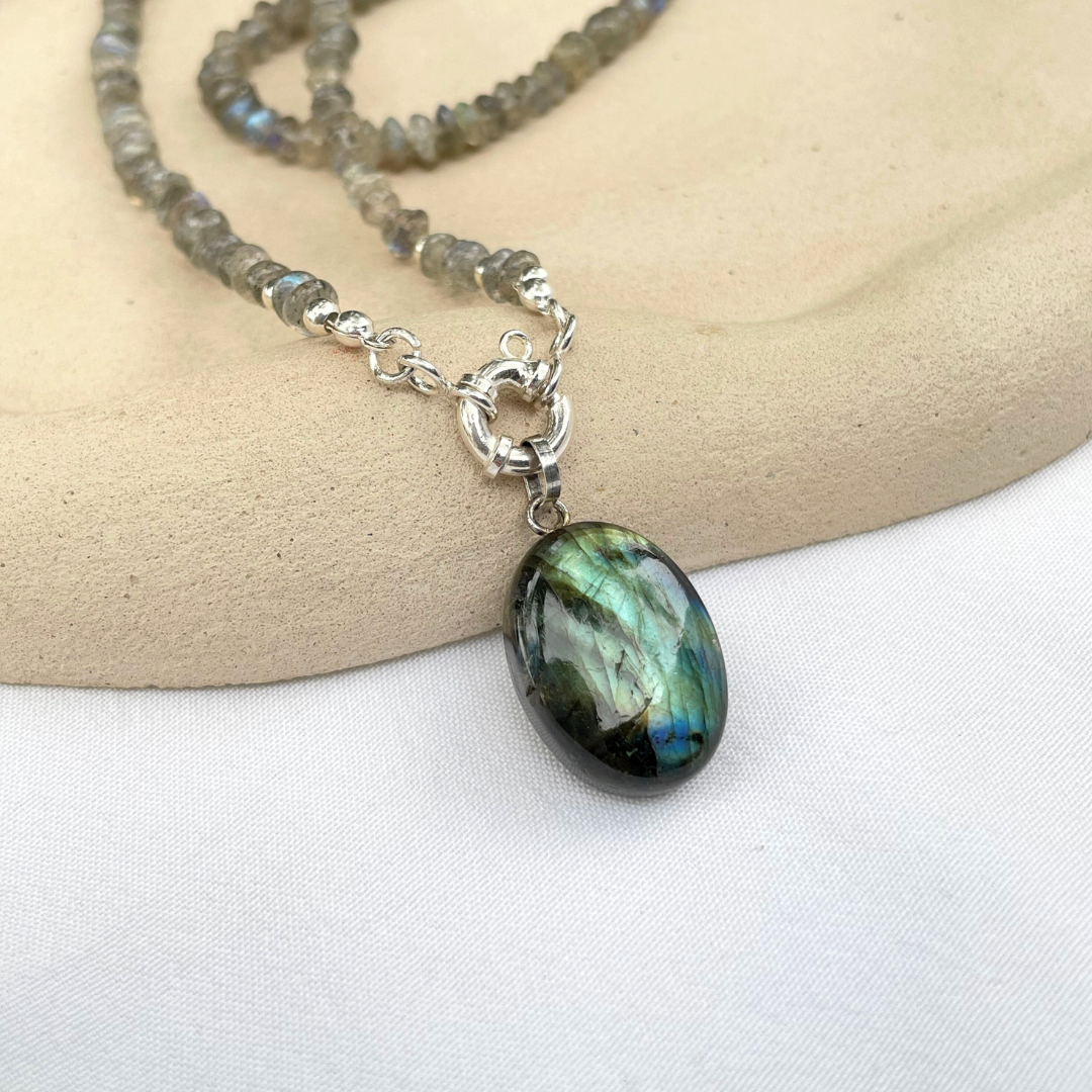 Colar de Labradorita em discos de 4mm com fecho bóia e pingente de Labradorita em prata 925