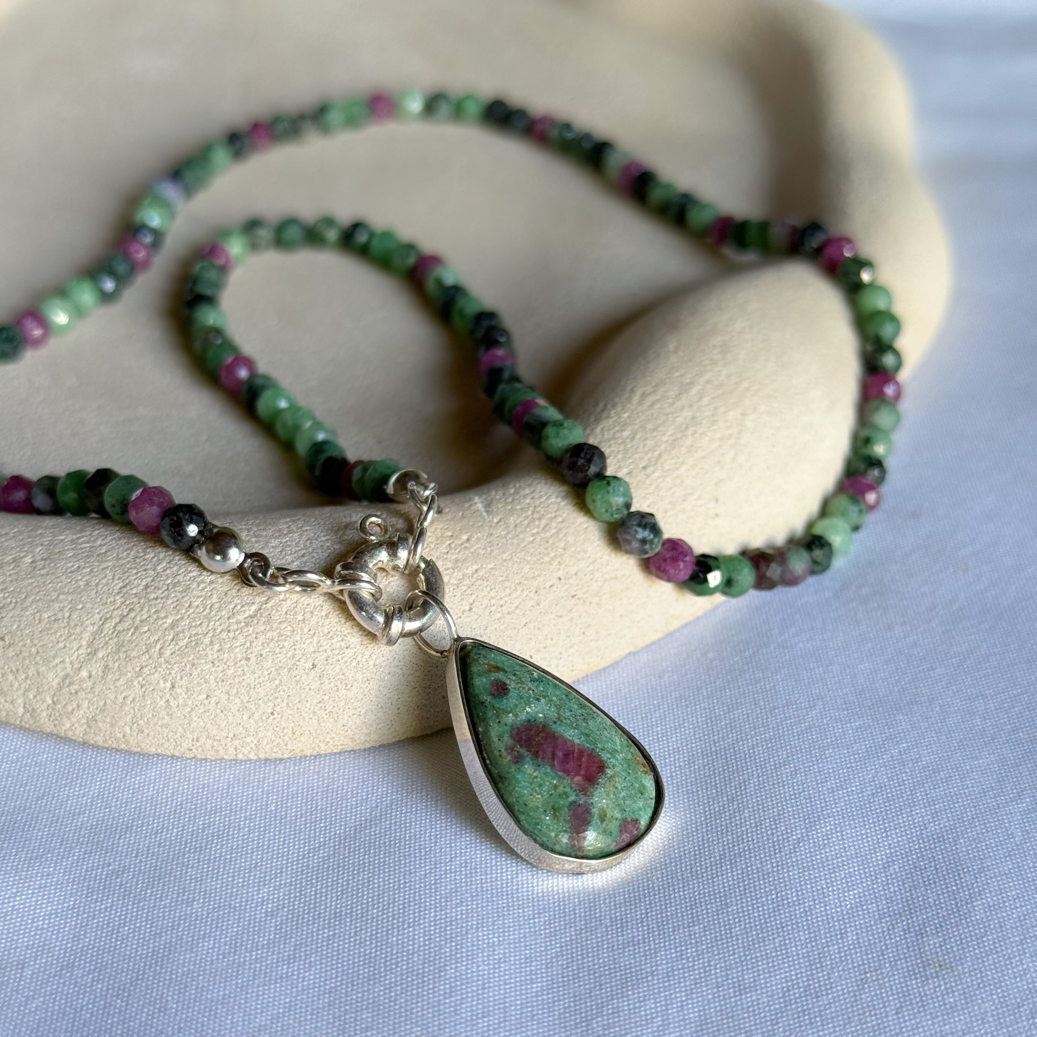 Colar de Rubi na Zoisita em esferas facetadas de 4mm com fecho bóia e pingente em prata 925