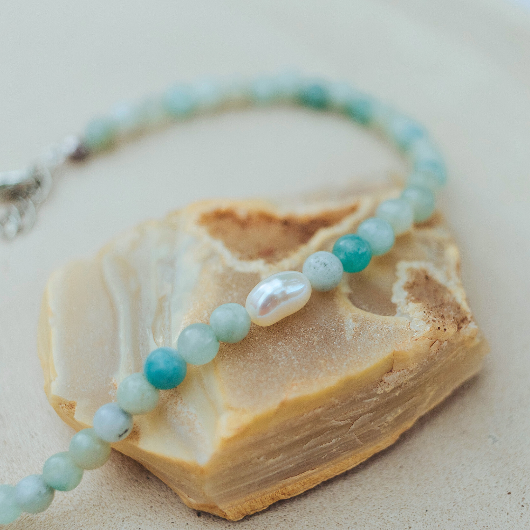 Tornozeleira de Amazonita em esfera de 4mm com Pérola de água doce natural